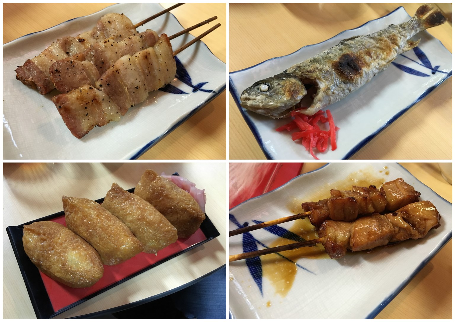 除了流水面,[长寿庵]还可以吃到寿司、烤肉串、和炸鱼。
